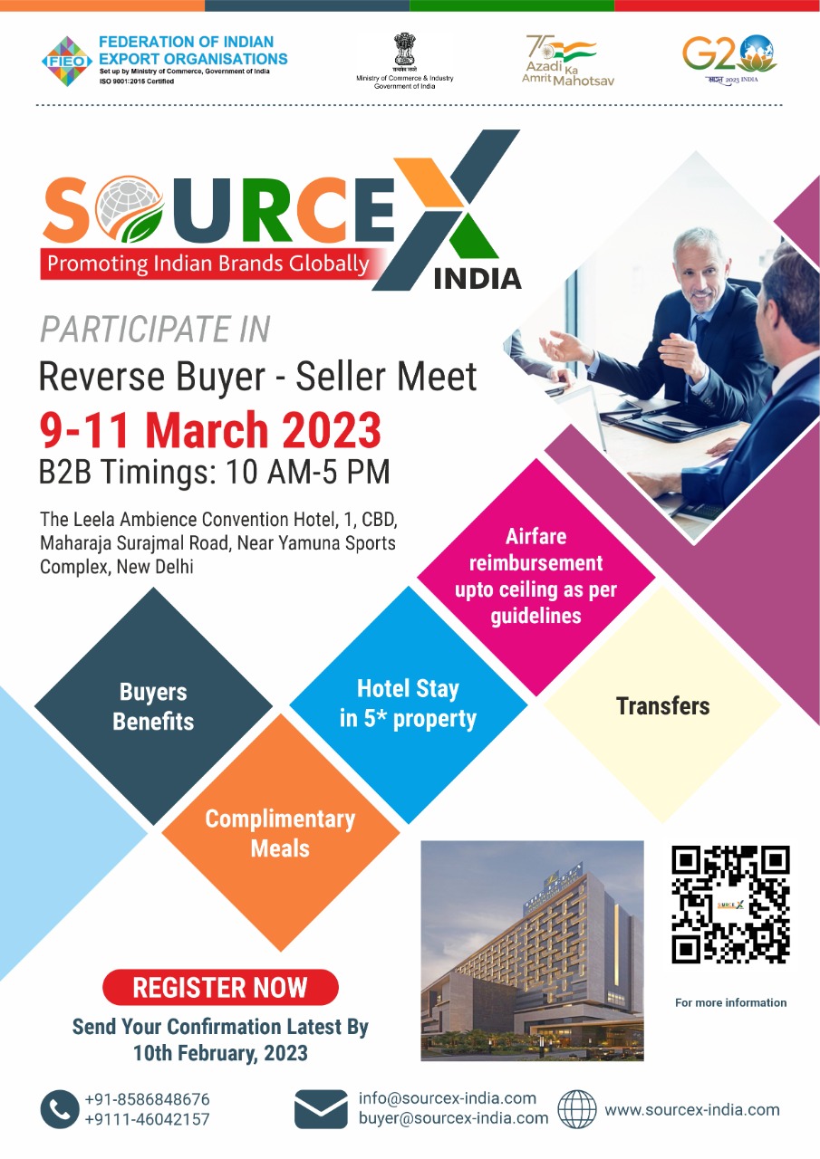 The High Commission of India has the pleasure to inform that Federation of Indian Export Organisations (FIEO) with the support of Ministry of Commerce & Industry is organising a Reverse Buyer Seller Meet - Sourcex India 2023 from 09-11 March 2023 at Leela Ambience Convention Hotel, Shahdara, New Delhi, India.