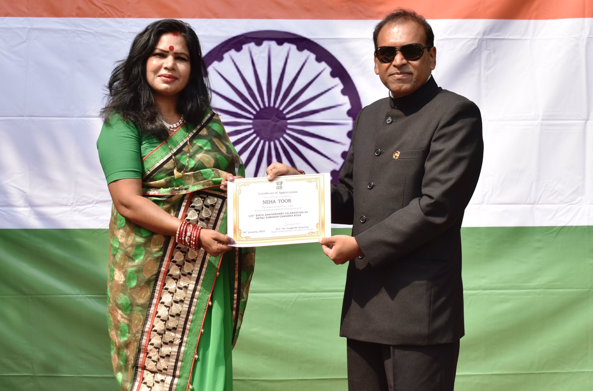 During Republic Day India celebrations at India House in Accra High Commissioner gave away awards to winners of essay competitions organised to celebrate Netaji@125 & Aurobindo@150