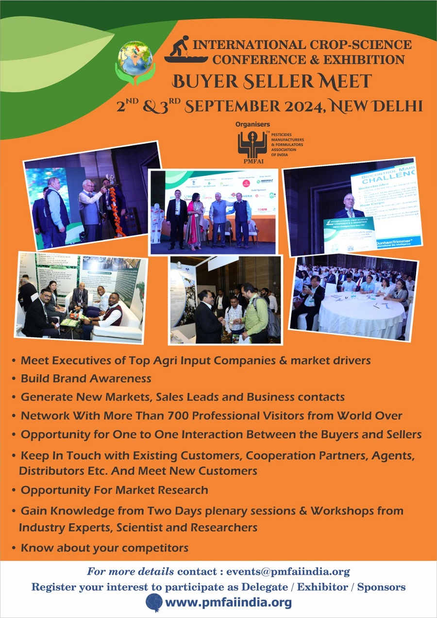 The High Commission of India is pleased to inform that the Pesticides Manufacturers & Formulators Association Of India (PMFAI) is organizing the 21st Edition of the  International Crop Science Conference and Exhibition (ICSCE) Buyer-Seller Meet on 2 & 3 September 2024 in New Delhi.
