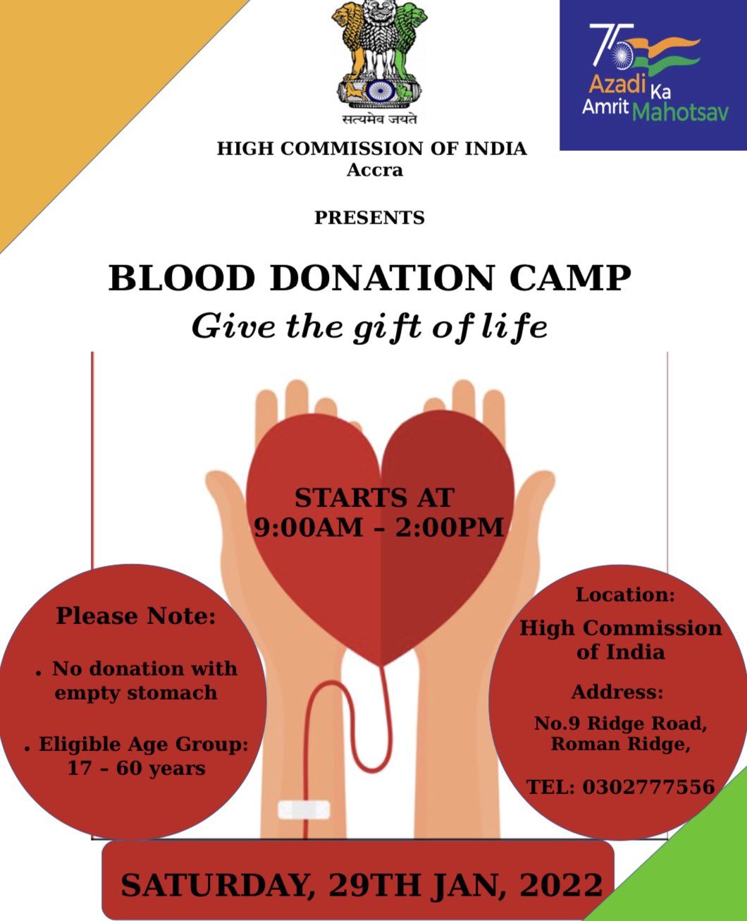 Celebrating #AmritMahotsav join us for blood donation at 9am onwards on Saturday 29th January at the High Commission of India.