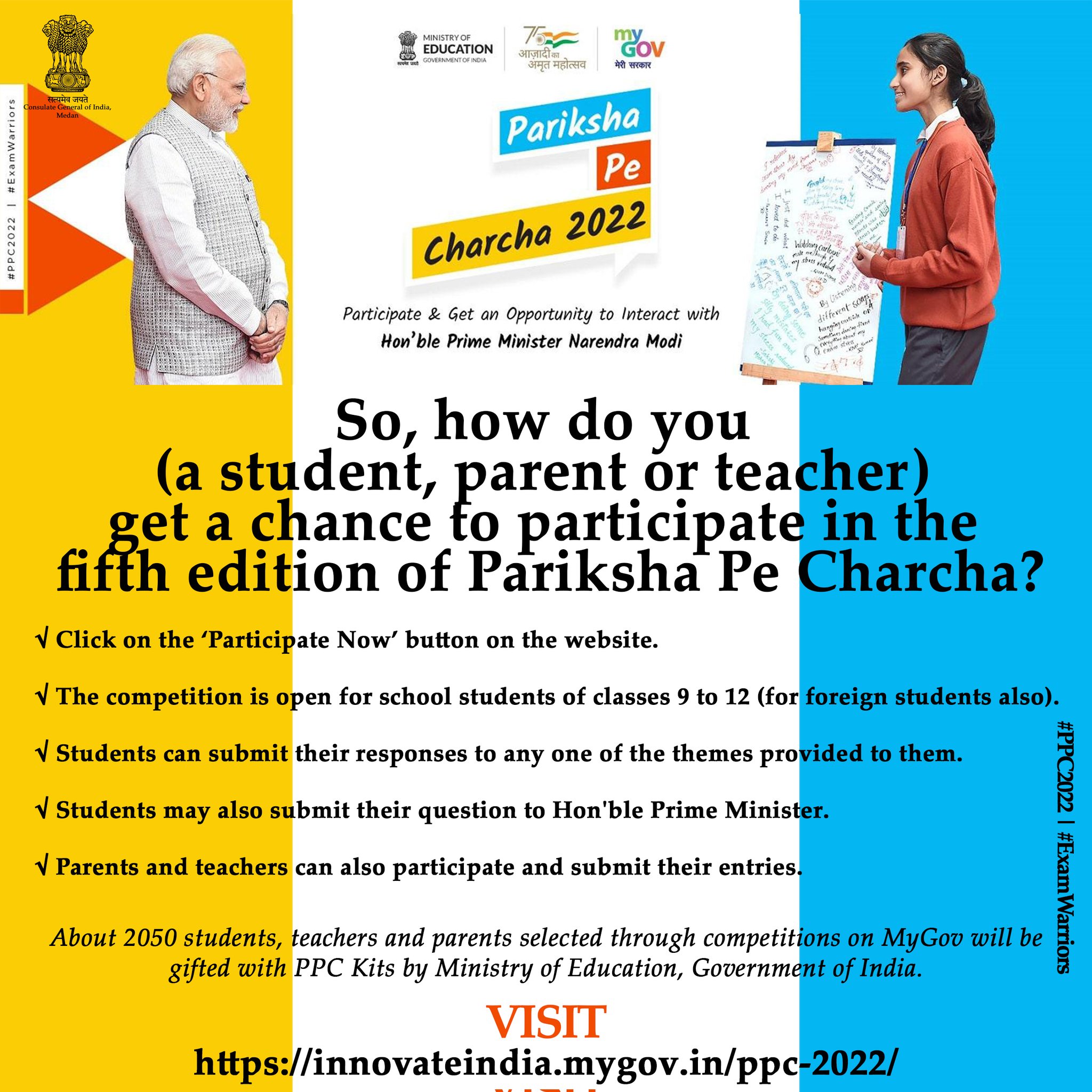 Pariksha Pe Charcha 2022 #PPC2022 ExamWarriors  : An initiative in which PM Modiji interacts with students,teachers & parents to share valuable tips to take board & entrance exams in a stress free manner.