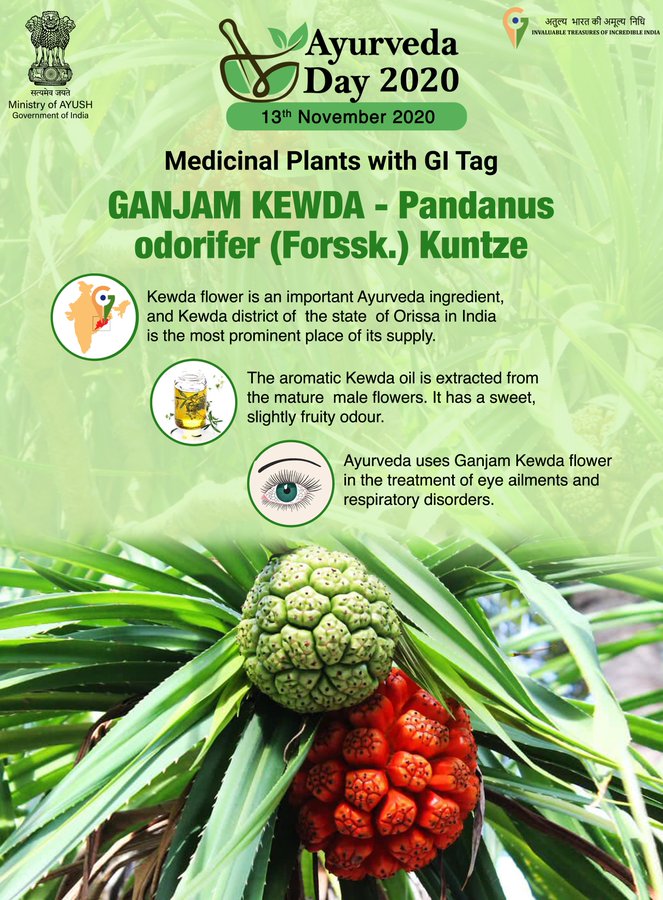“Kewda flower” also known as Ketakipushpa in Ayurveda obtained GI tag for the state of Orissa where it is extensively cultivated. It is associated mostly with the Ganjam district. It is a well-known scent producing and flavoring agent. As medicine it is useful in treatment of eye ailments and respiratory disorders.