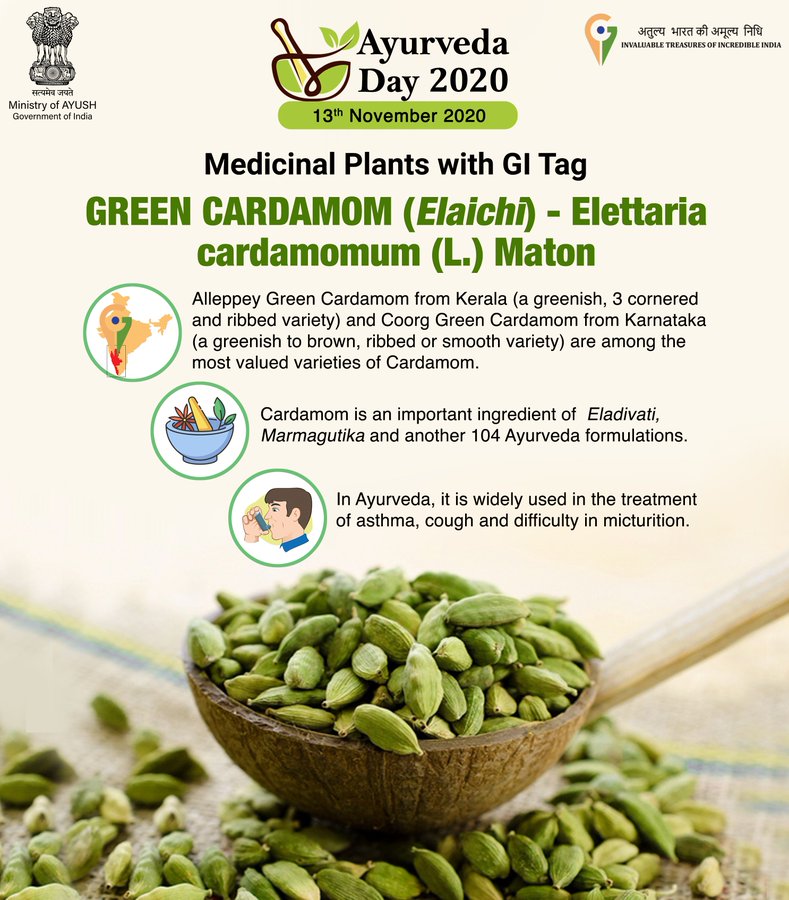 In Ayurveda “Green Cardamom” isknown as Sukshma-ela and Elaichii. It is used in treatment of Asthma, Cough and indifficulty in Micturition.