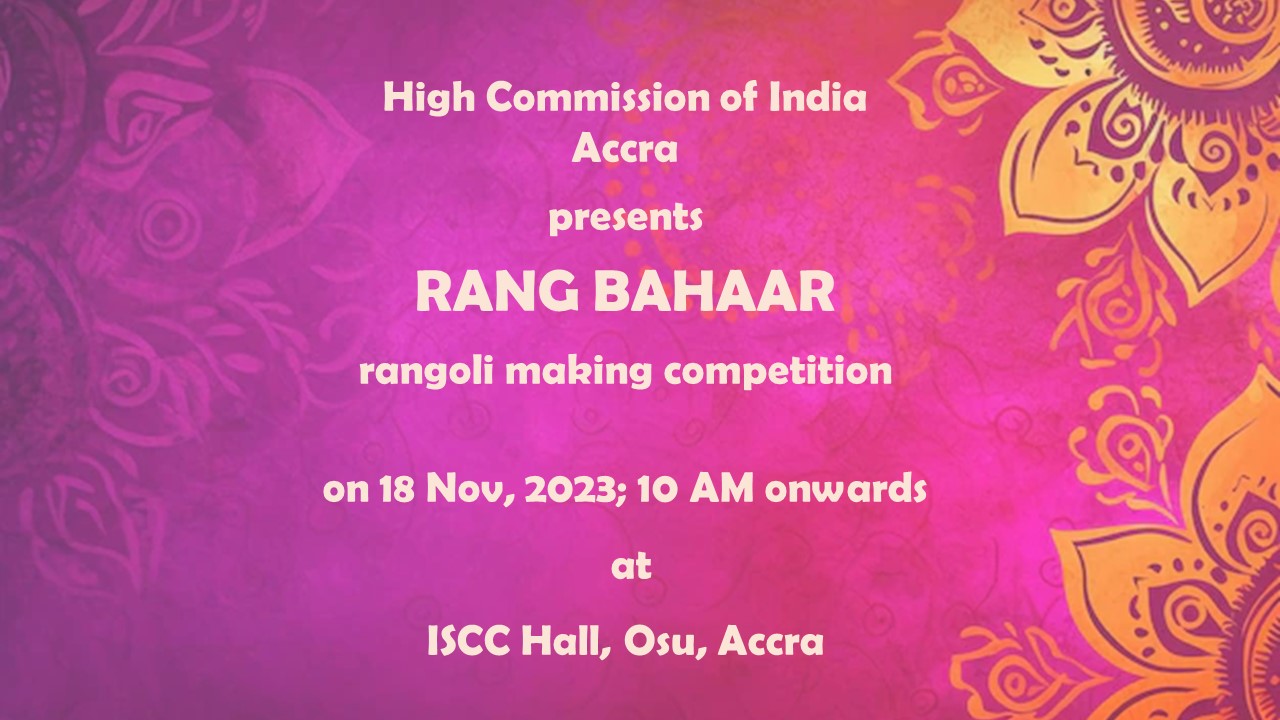 'High Commission of India, Accra invites members of the Indian community to participate in 'Rang Bahaar Rangoli Making Competition' on 18 November, 2023. To participate, register at https://forms.gle/PEn29uBxMUeWBCvu7