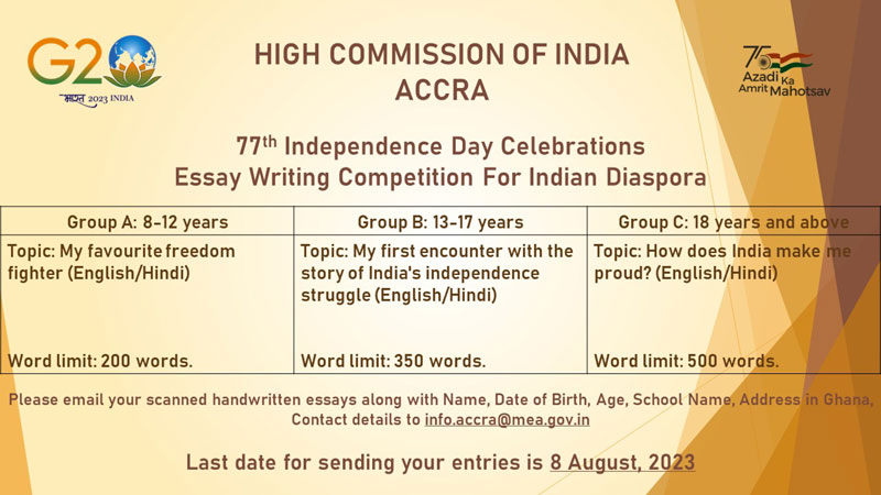 The High Commission is organising an Essay Competition for members of the Indian Diaspora in Ghana on the following topics for three age groups: