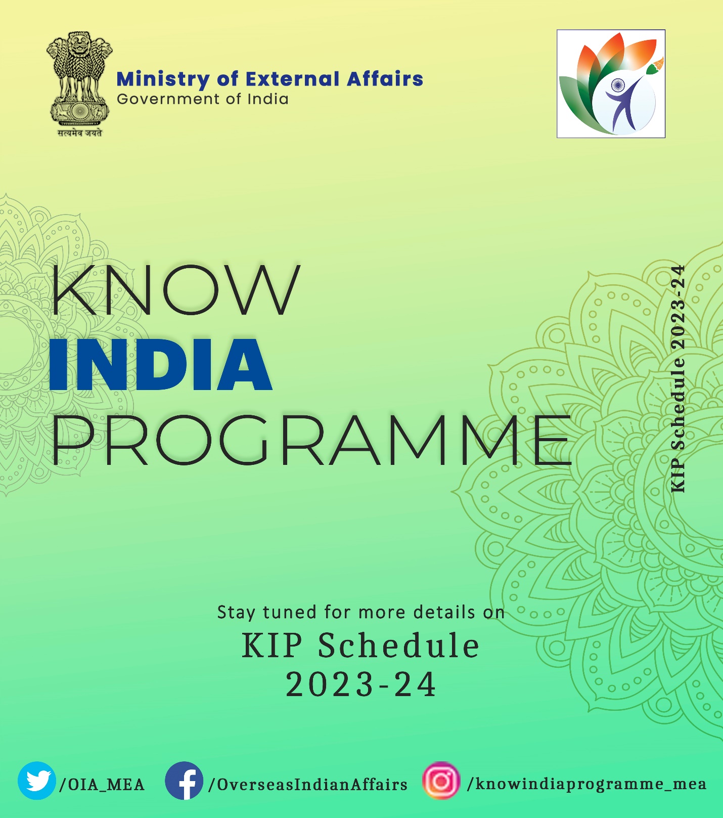 KIP is an engagement programme for Diaspora youth (between the age of 18-30 years) of Indian origin to introduce them to India and promote awareness about different facets of Indian life, our cultural heritage, art and various aspects of contemporary India. This programme is open to youth of Indian origin (excluding non-resident Indians).